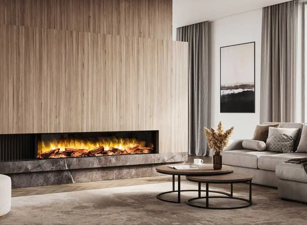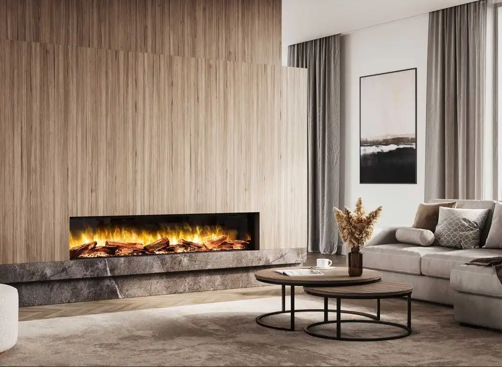 Zabudovateľný elektrický krb s čiernym zadným sklom a autenticky vyzerajúcim efektom plameňa s možnosťou čelného, rohového alebo trojstranného prevedenia.