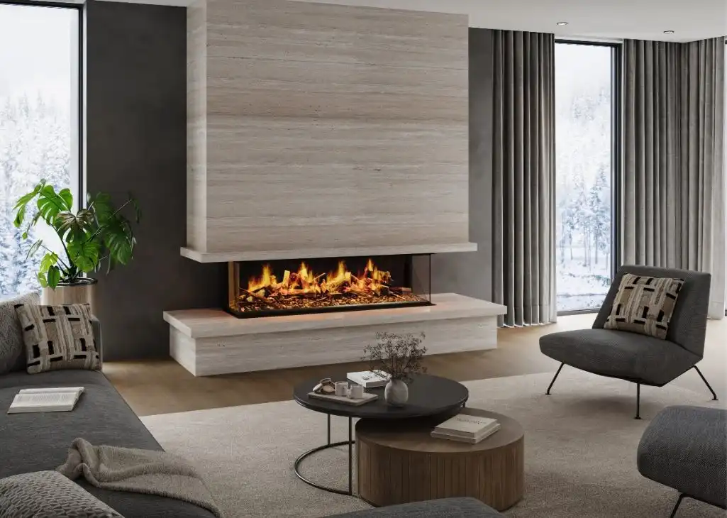 Zabudovateľný elektrický krb s holografickým premietaním vyčarí autenticky vyzerajúcim efekt plameňa ako na dlani vďaka trojstrannému preskleniu.