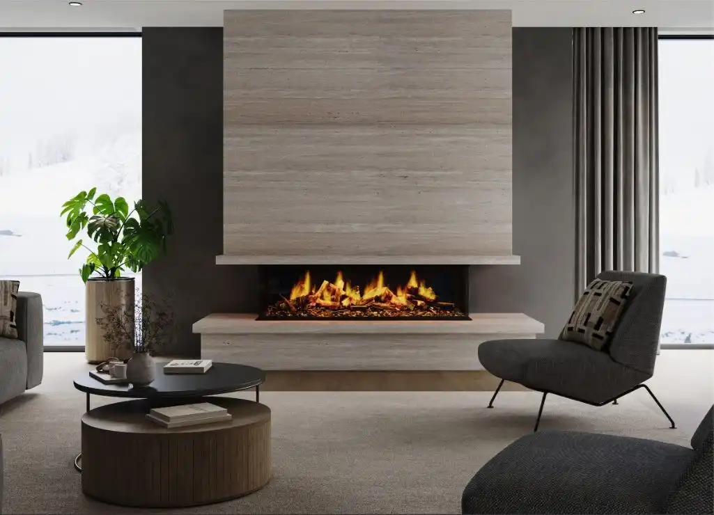 Zabudovateľný elektrický krb s holografickým premietaním vyčarí autenticky vyzerajúcim efekt plameňa ako na dlani vďaka trojstrannému preskleniu.