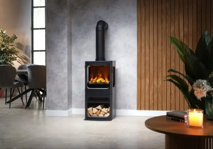 Ohnisko je tvorené polienkami. Plameň nezávislý od kúrenia vám umožní používať krb po celý rok, dokonca aj v horúcich dňoch. Užite si oheň, kedykoľvek chcete. Kúrenie môžete kedykoľvek zapnúť alebo vypnúť. Spotreba efektu plameňa bez ohrevu je 125 W. Krb sa dá ovládať manuálne alebo diaľkovým ovládačom.