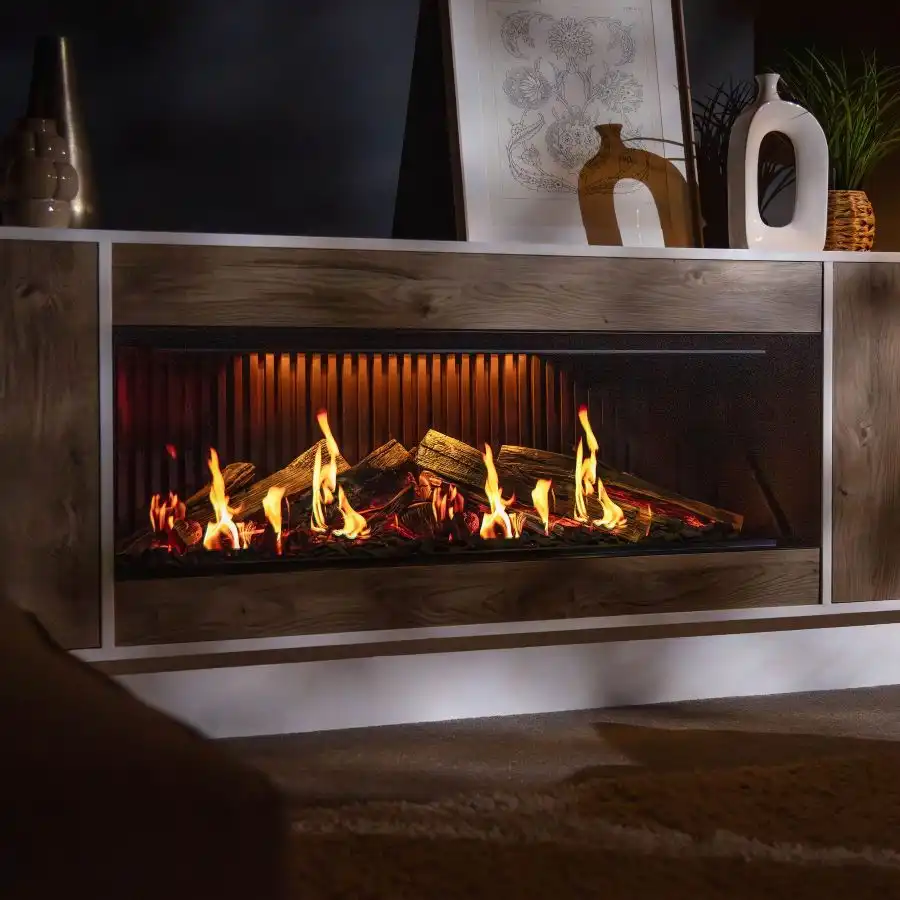 Elektrický krb s autenticky vyzerajúcim efektom plameňa s obstavbou. Kombináciou prírodných textúr s čistými súčasnými líniami dokonale orámuje plameň a zároveň ponúka praktické skladovanie a nadčasový štýl.