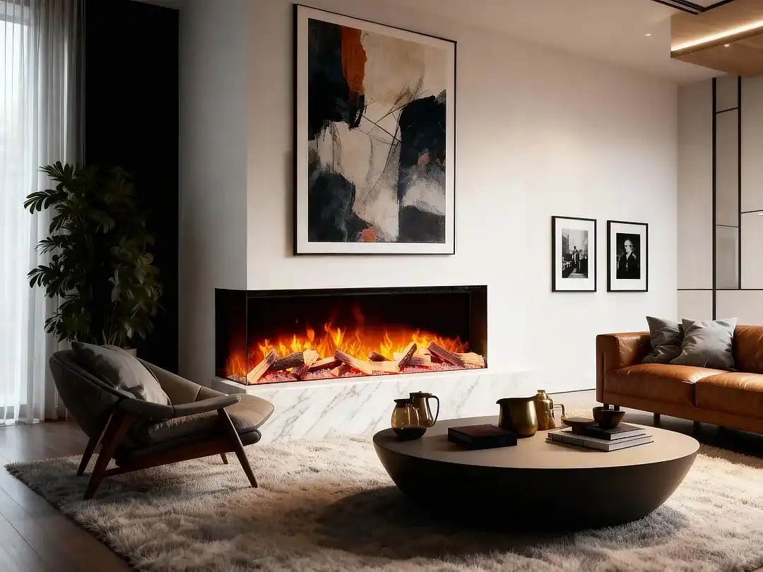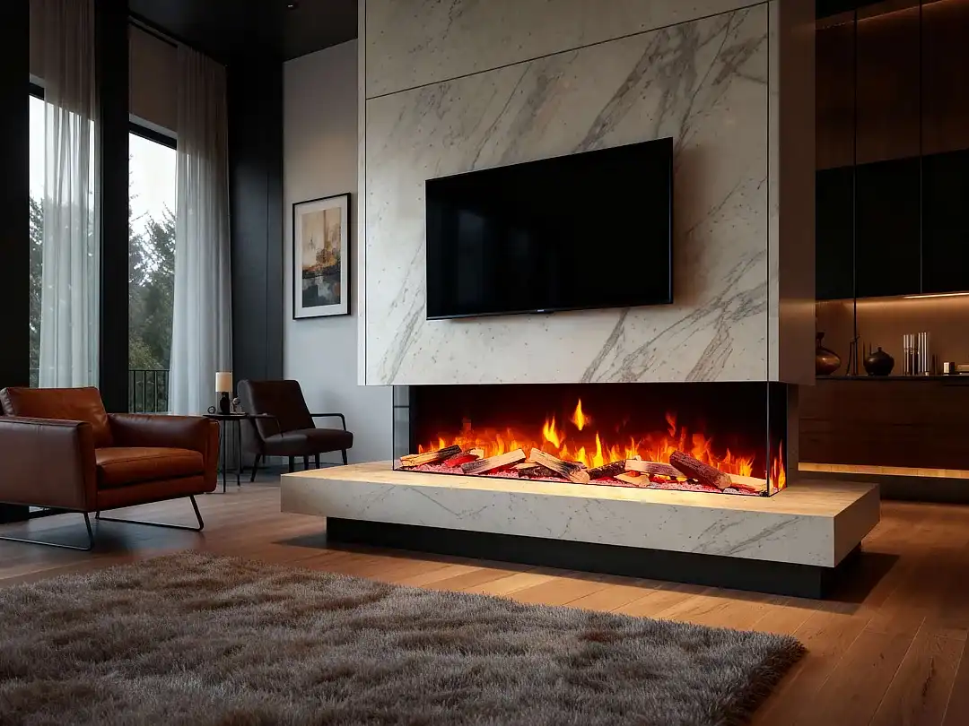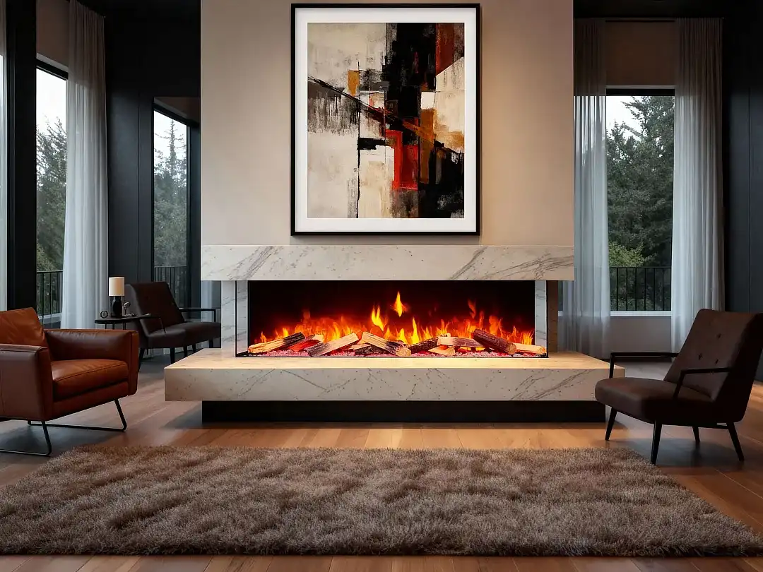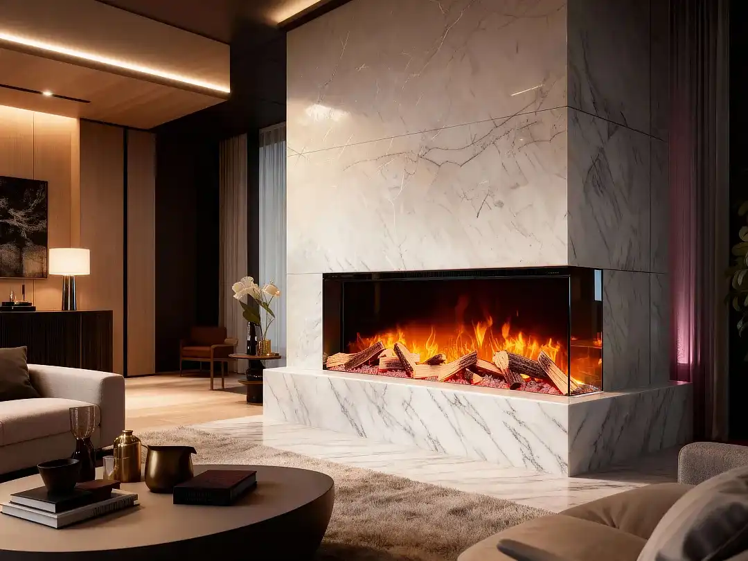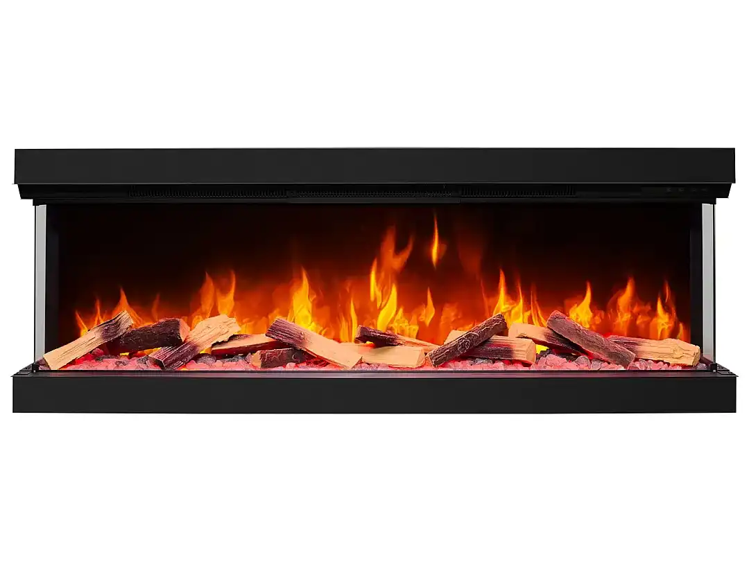 Elektrická krbová vložka s trojstranným presklením určená na zabudovanie do steny.