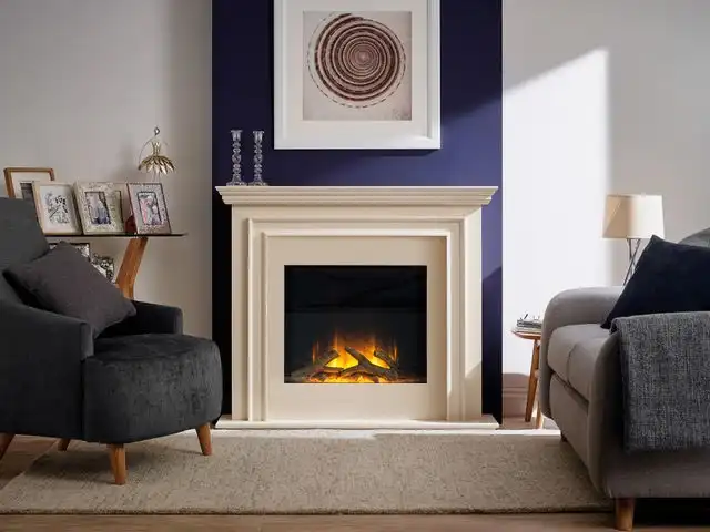 Elektrický krb v príjemných farbách s jemnou dekoráciou na obstavbe.